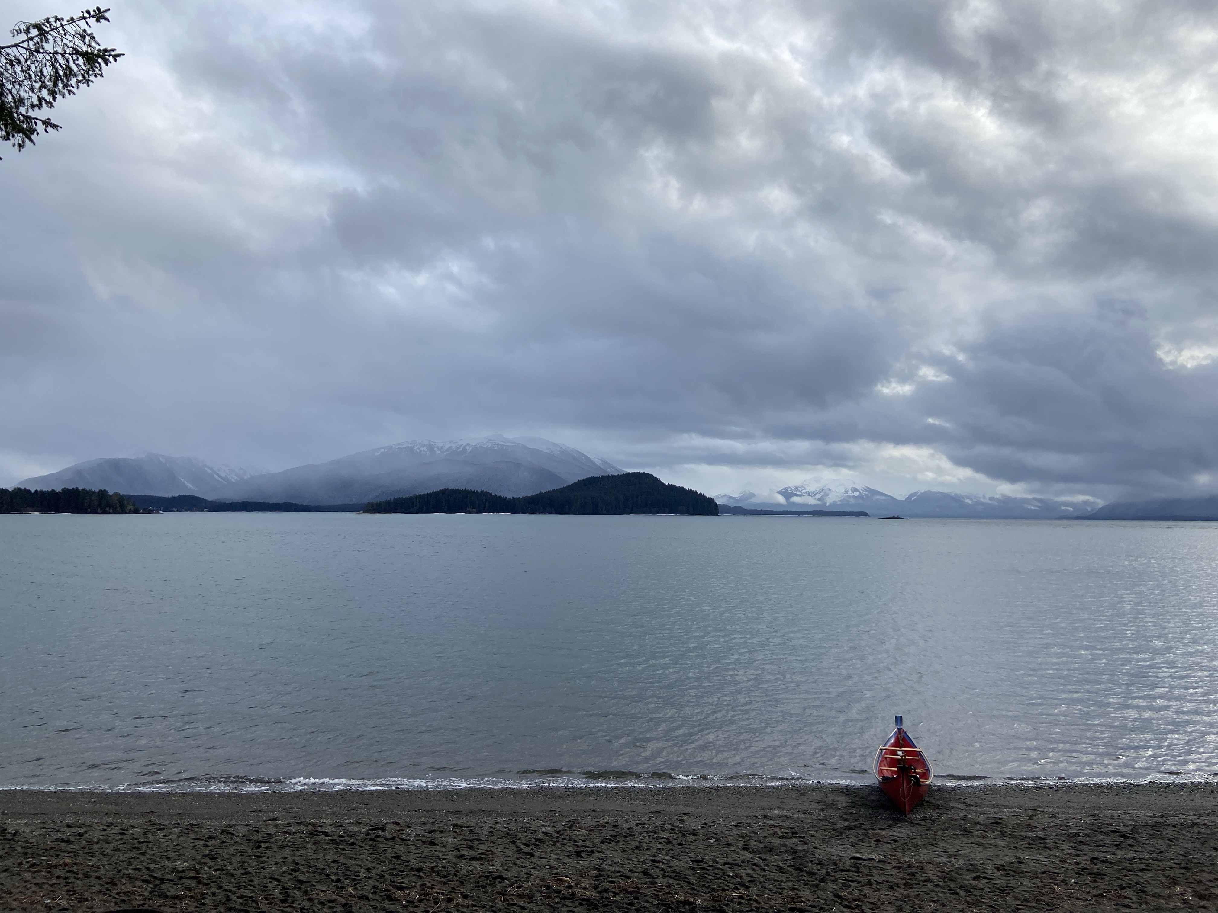 The duggout canoe at Auke Recreation Area, snow storm on the horizon.