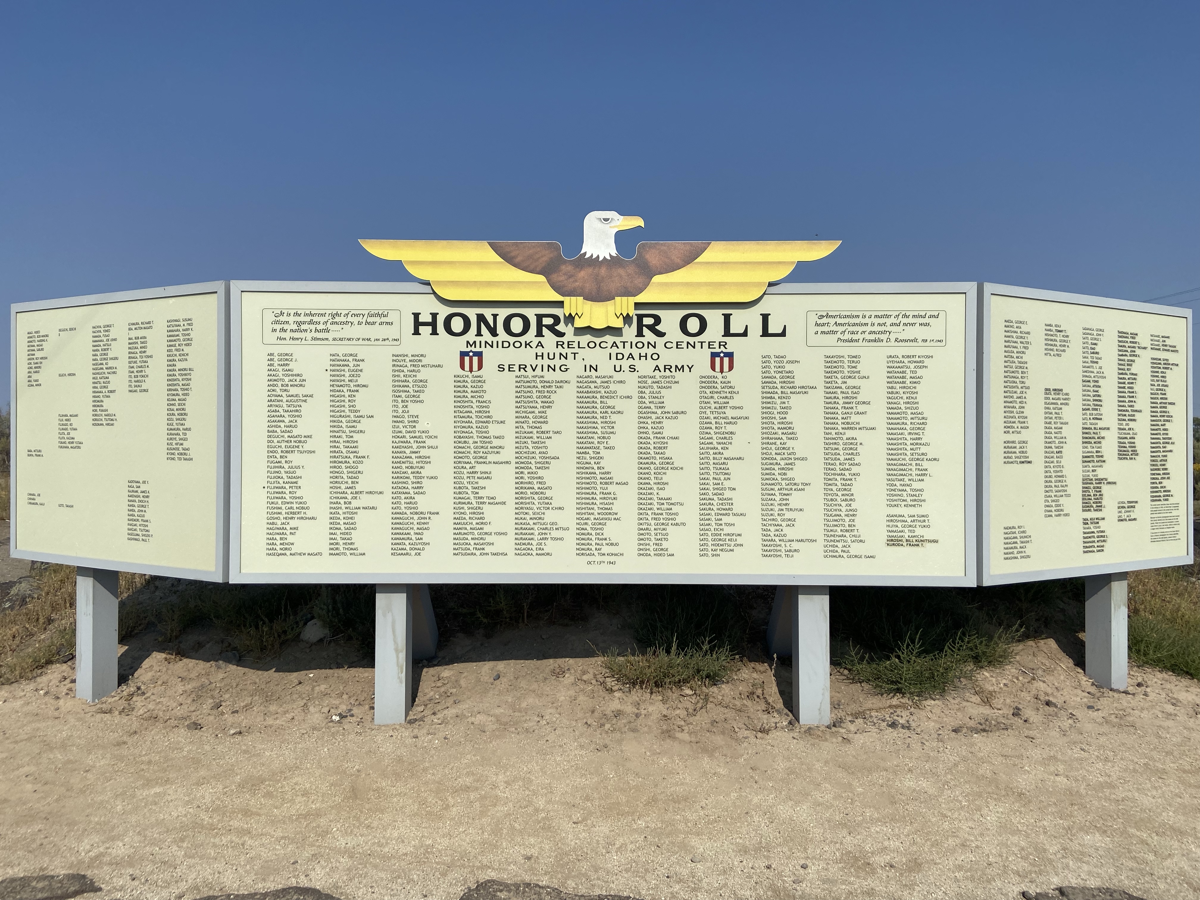 There is an “Honor Roll” board of camp residents who served in the armed forces in defense of the very country that doubted their loyalties and relocated them.