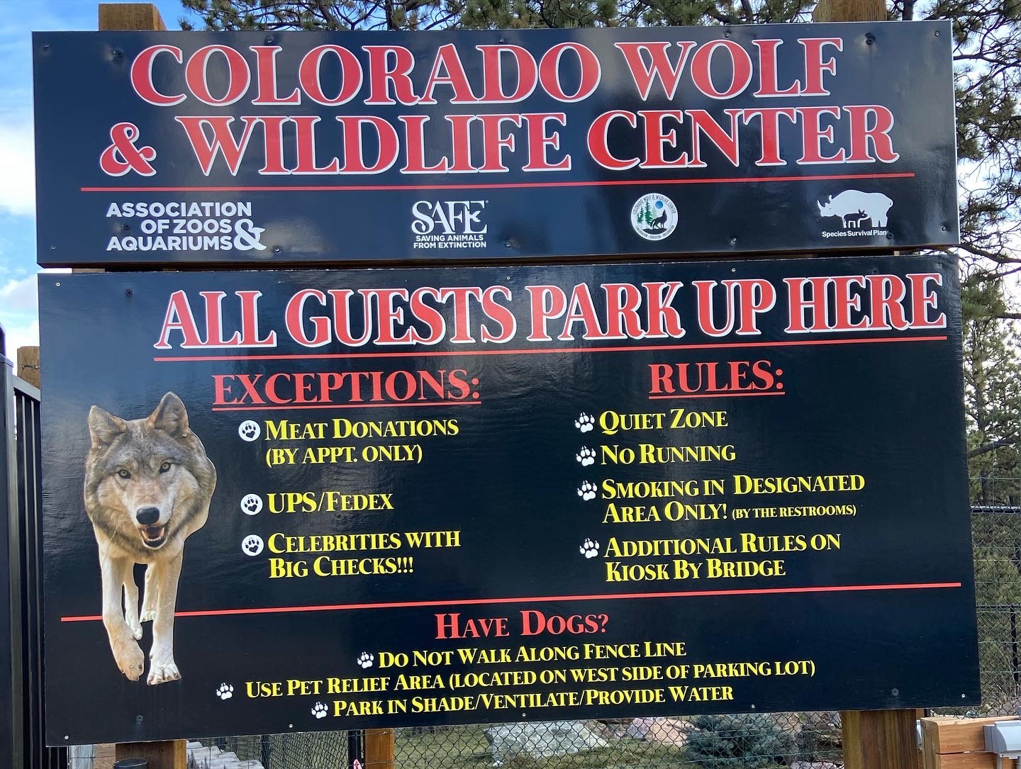 On the way to FLFO we passed a sign for the Colorado Wolf & Wildlife Center and decided we must investigate on the way back. Unfortunately the wildlife tour tour timing didn’t work with our plan for the day, but we watched as a group of about 4 people went into a wolf enclosure and gave two wolves head and back scritches like they were dogs. We figured out this was a private tour. Putting a pin in this place to return if someone wants to shell out for the chance to hang out with the wolves.