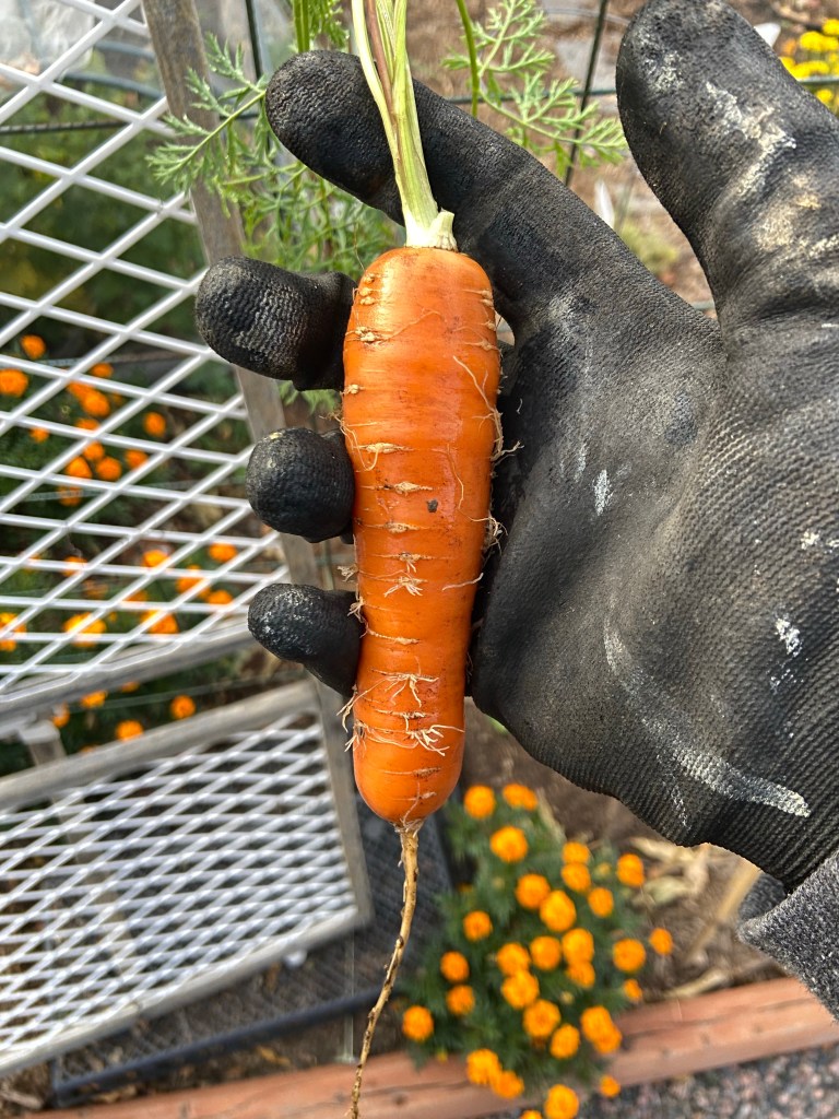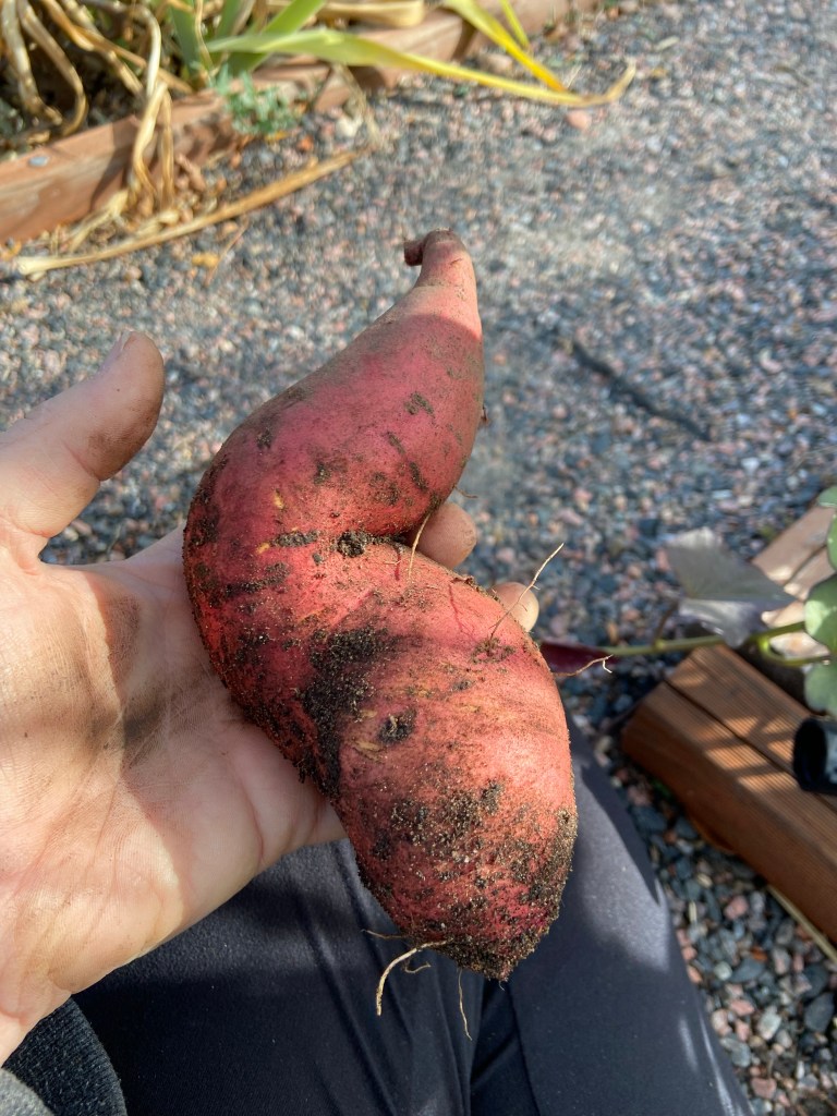 These are my first grown and harvested sweet potatoes! I started them from slips off of a grocery store sweet potato, and pretty much just watered them and pinned their vines up as they grew all season. Finally I decided I couldn’t wait any longer to see what was going on underground. To my delight I found at least one kind of big sweet potato! Digging them out was not easy since the skin is so tender. Next year if I grow again my plan is to grow in grow bags so I can dump them out and make sure I’ve got them all without damaging them in the process.