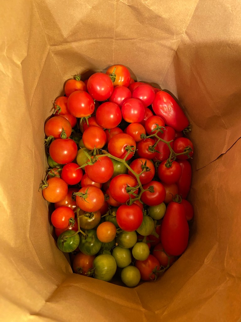 The tomato plants are out, but I still have some tomatoes sitting around getting ripe. I put a bunch of green and partially ripening ones in a big brown bag and they just keep ripening. I keep roasting them and freezing them for future soups and sauces.