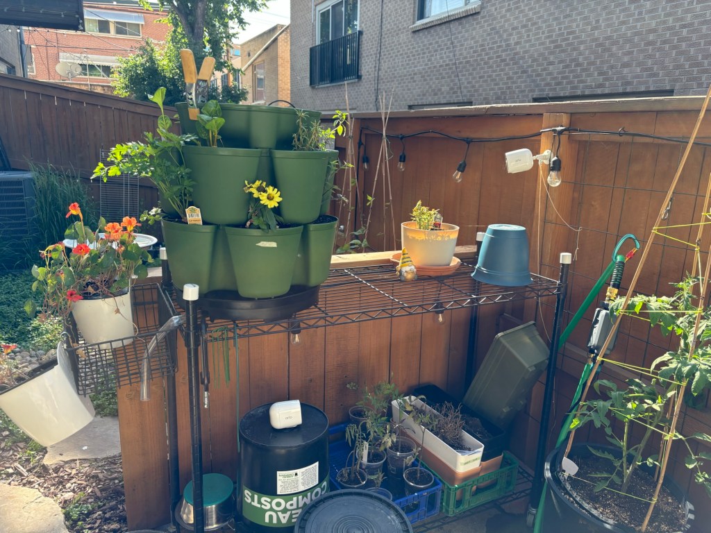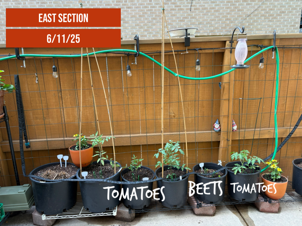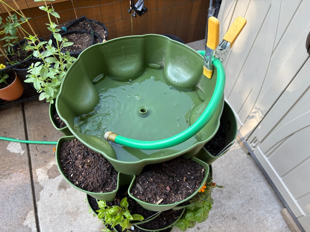 I set up my hoses to cover me while on vacation. It’s a dual timer hose controller. One hose goes into the top of a greenstalk, the other runs a soaker hose along my containers in the patio. Some leaks and challenges distributing water consistently down the line, but working it out.