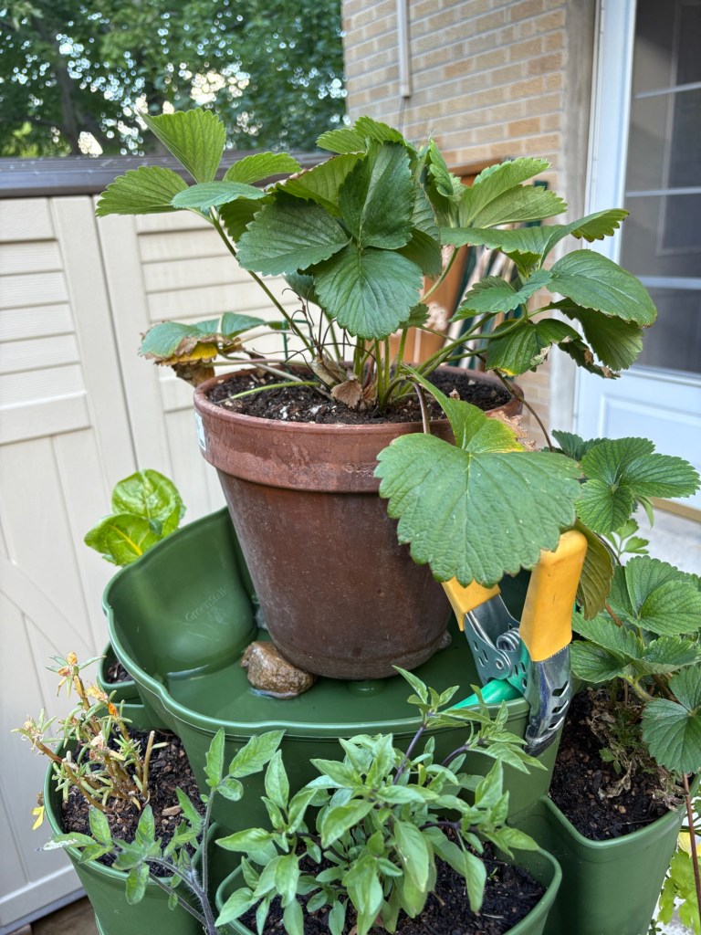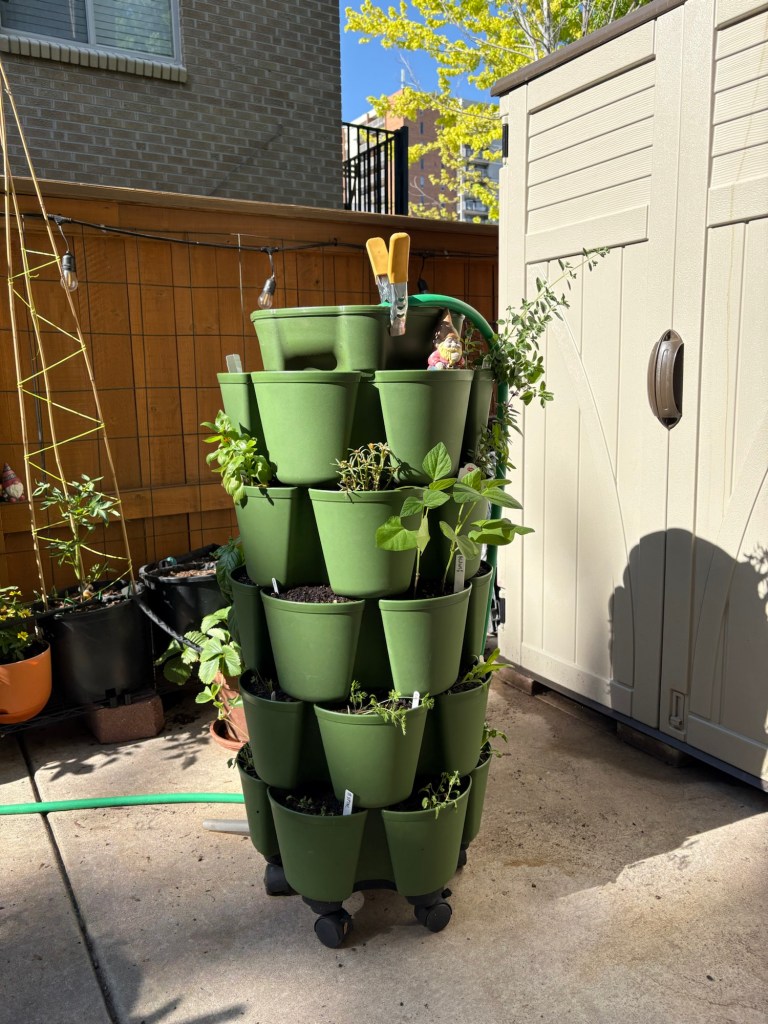 I split the stack and put a few tiers up on the shelf so they can get more sun. This works great until I go out of town. I have to re-stack them so my hose timer can water the whole thing from the top while I’m gone.