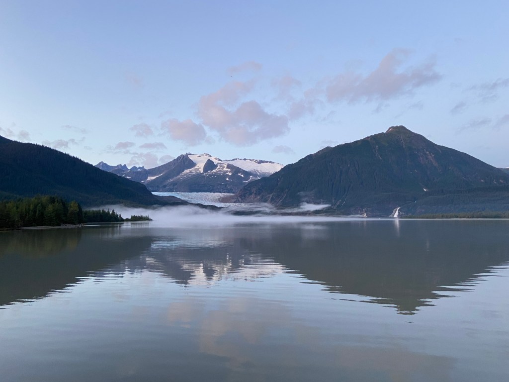 Standing at the skaters cabin looking over this lake, my senses are assaulted with the fresh smell of spruce and water, the chill from the glacier, seeing my breath in the crisp air, watching the haze drift across the lake, and hearing nothing but the sound of my shoes on the mud and the dogs swimming in the lake down the beach.