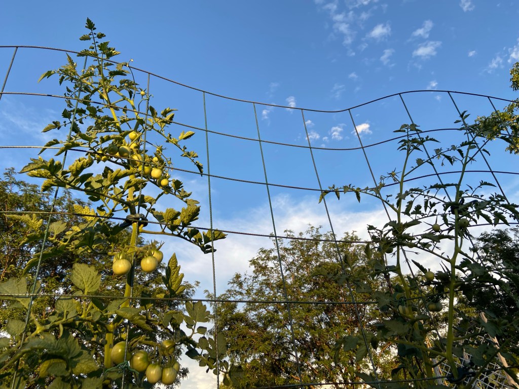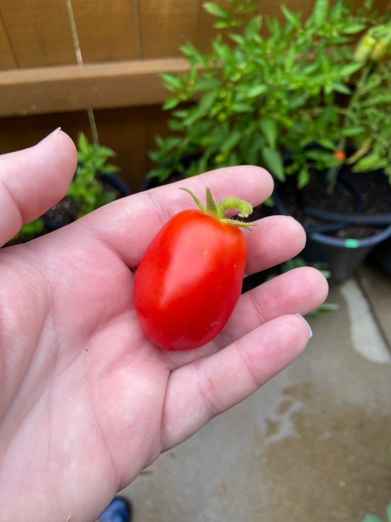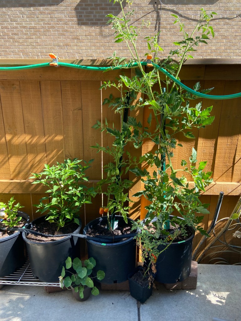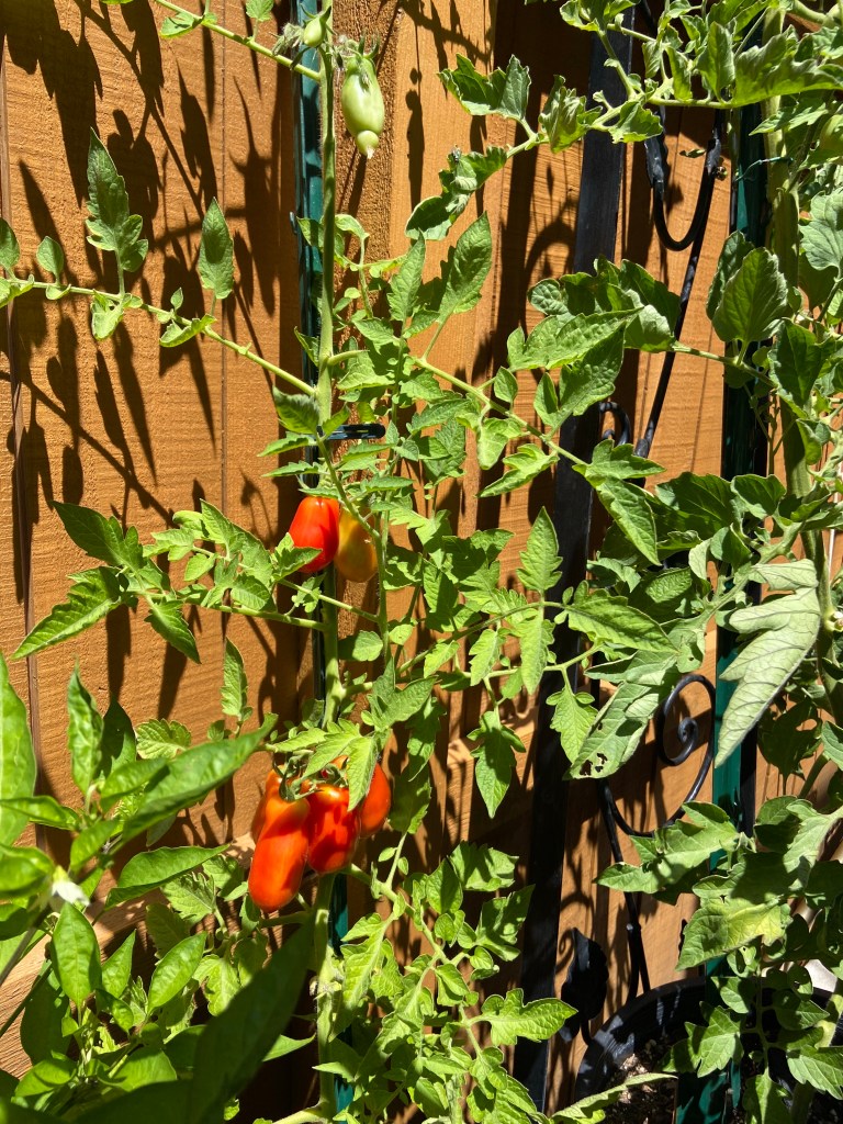 They got a slow start but they’re doing great right now. The pink ping pong (ppp) variety I tried this year is really vigorous and productive so far, and the tomates really are slightly pink and ping pong ball sized! The San marzano romas are another new addition this year and they look pretty good. The ones in my yard are doing much better than the ones in the plot. Just one issue with bacterial spot, new to me. Haven’t done much to tackle it.