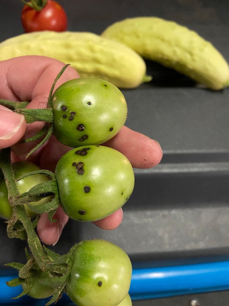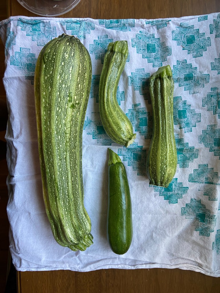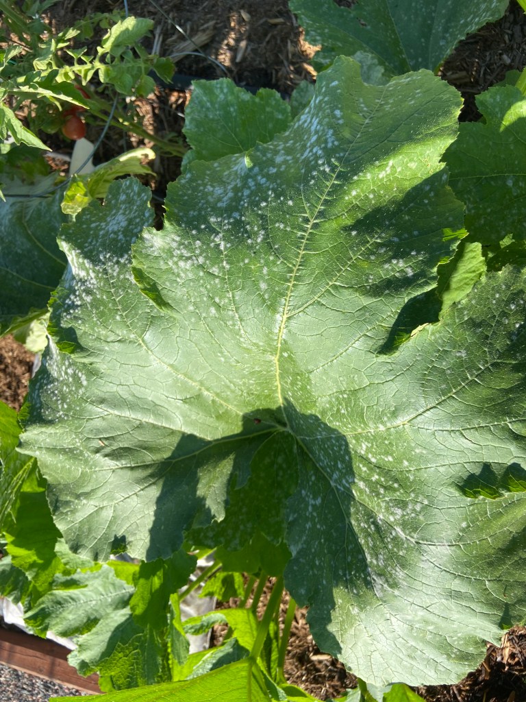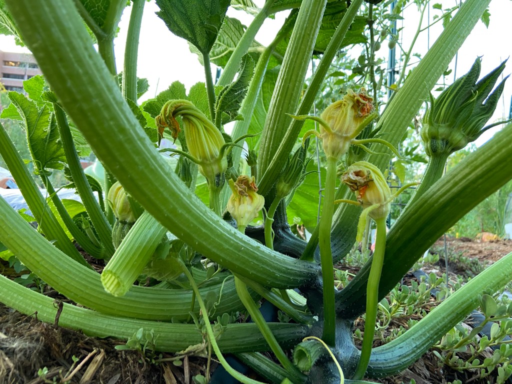 I came back from Ireland to find a zucchini monster in the form of the costata romanesco (cr) squash plant. It has grown massively and produces a ton of squash. I even got a double squash!! The smaller black beauty zucchini plant isn’t producing much fruit. I grew it up inside a tomato cage as an experiment to help it grow vertically rather than rambling on the ground. I think as a result the flowers are too close together and packed in with the leaves making it harder for pollinator to do their jobs? I’ve seen a lot of female blossoms that haven’t matured to fruit. Good to know. Also have powdery mildew again. I treated with Biofungicide. Should have pre-treated sooner.