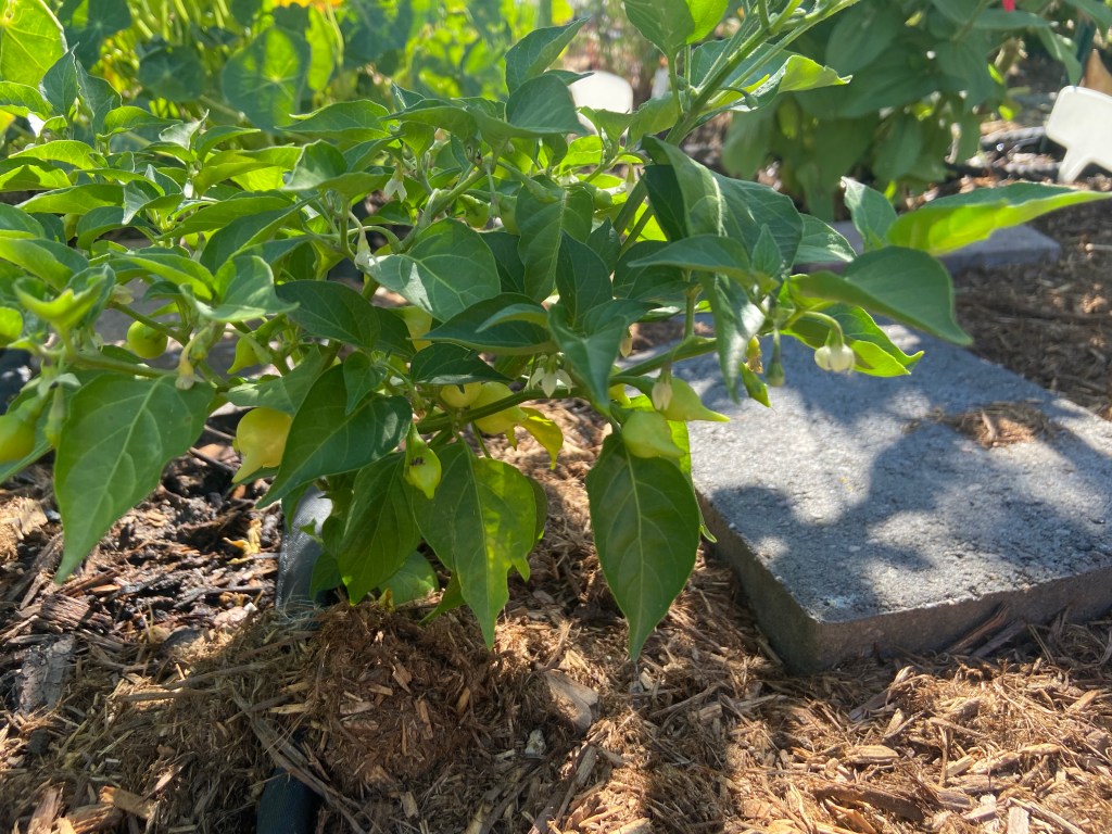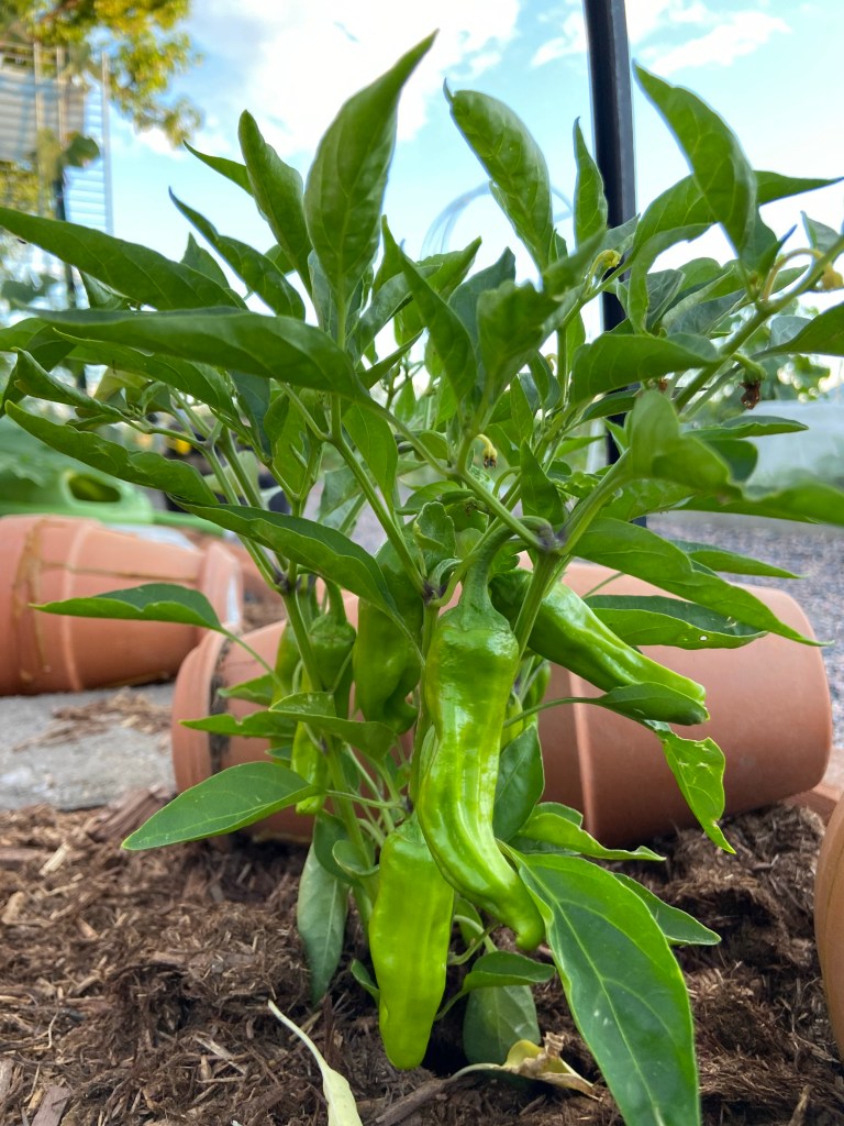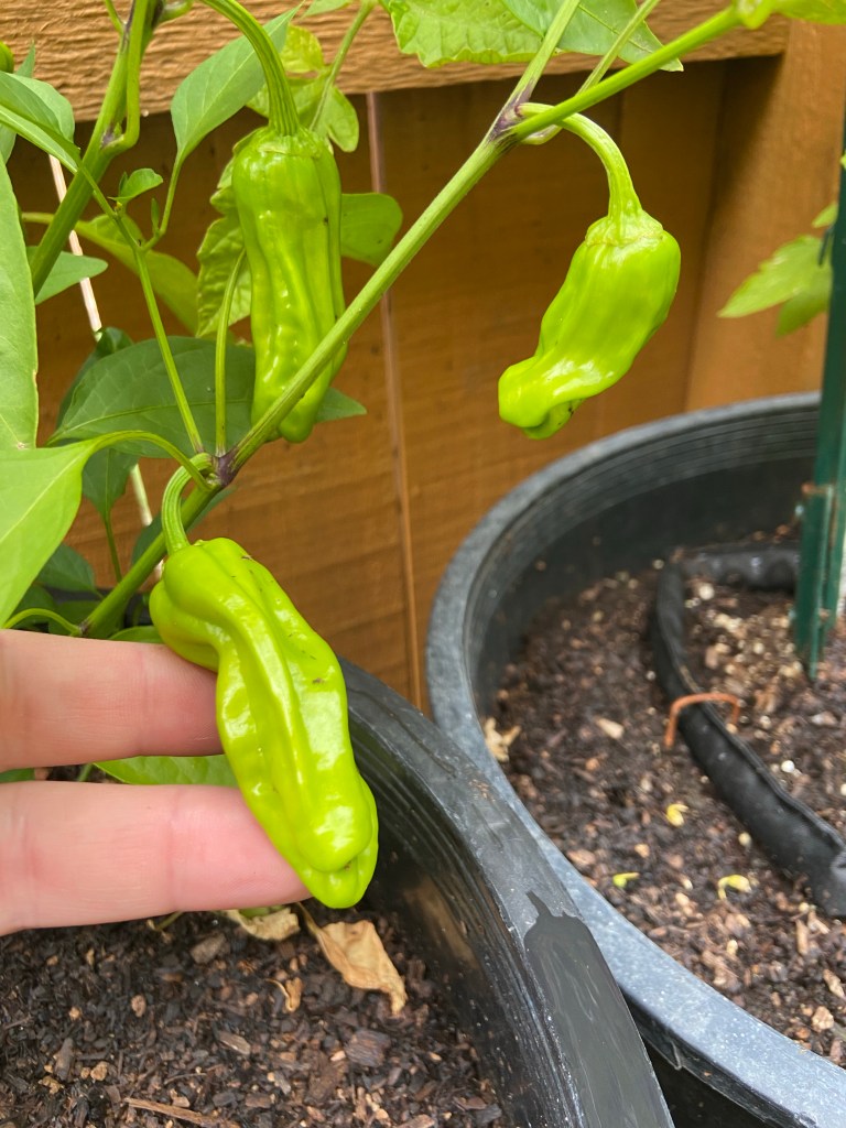 I have lots of poblanos on deck. Not sure when they’re going to be ready, they’re still pretty wrinkly, but at the same time I have one turning red. First year growing these, we’ll see how it goes.