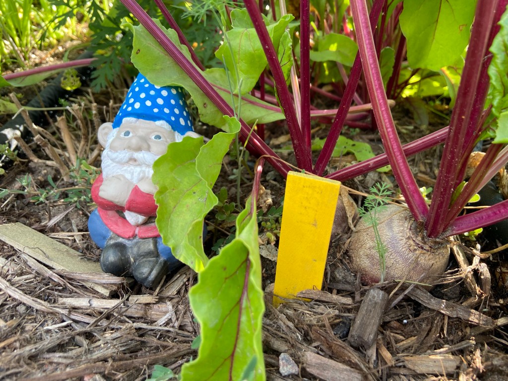 The yard garden has been underway for a month, the gnomes are on duty, and things are starting to grow!