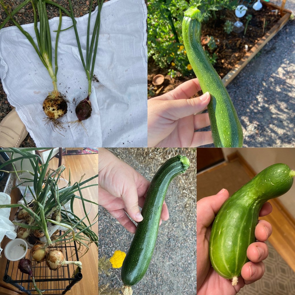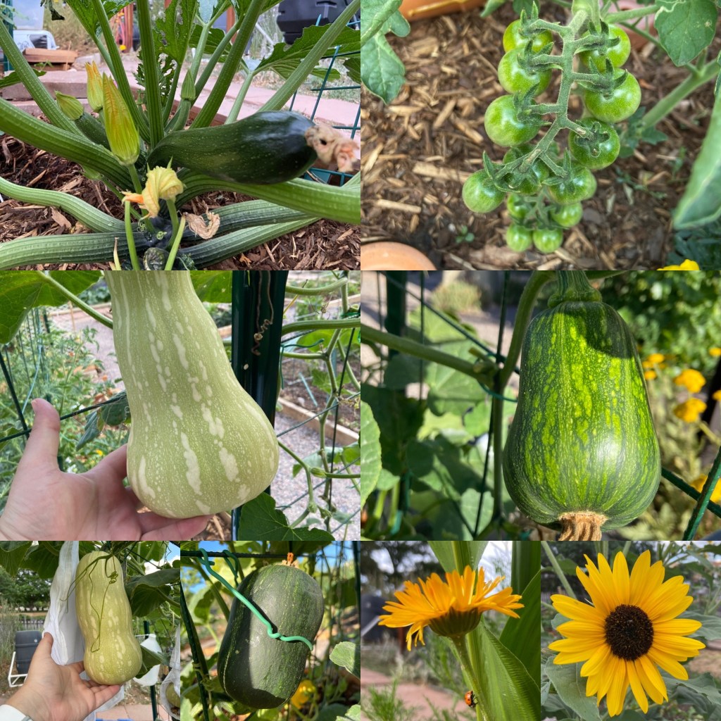 2 weeks worth of garden harvestHappy zinniasBebe bihquino pepperMonster zucchiniHappy plotWall of tomatoesOne of two nearly ripe(?) butternutsOne of many nearly ripe(?) and not ripe honeynuts Baby romanesco squashBaby silver slicer cucumberEpic cosmos plant with zero flowers so far