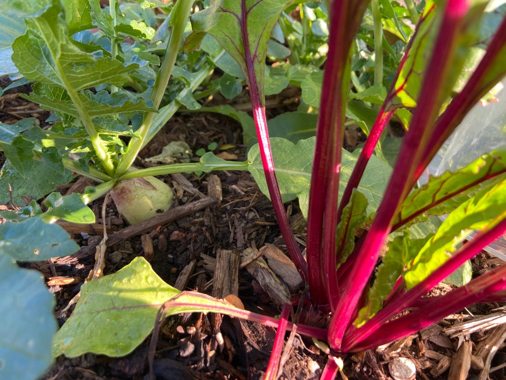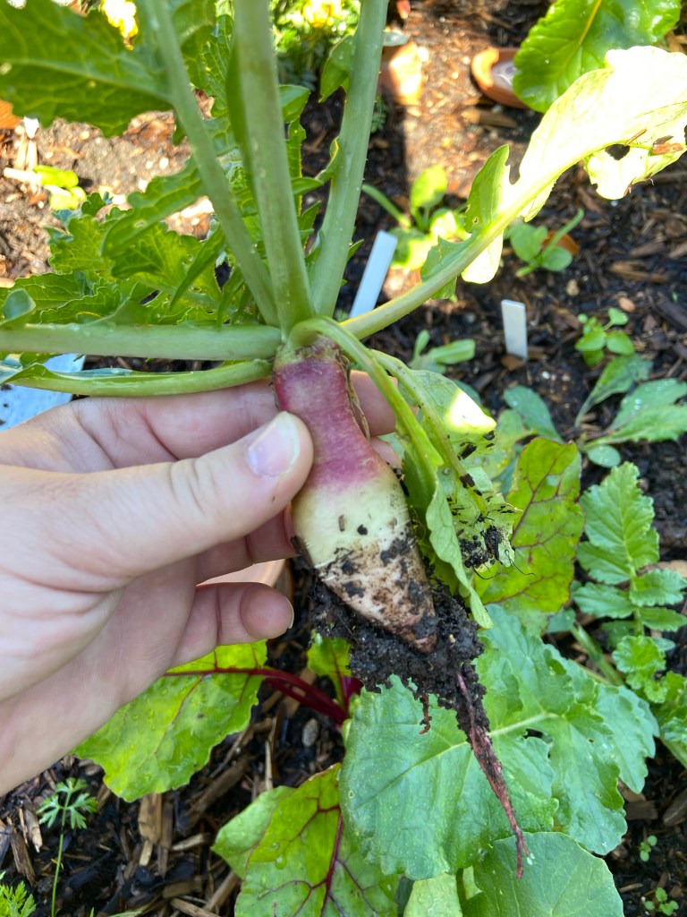 The major development is the construction of my mini warm house for radishes, carrots, beets, and spinach that are still growing. They should be fine without it for a bit longer, but I’m using this as a learning experience. I already learned that plastic trash bags are unwieldy and shower curtains are the way to go. My neighbor also has a pole along the bottom seam on both sides which is a pro move to hold the ends down evenly.